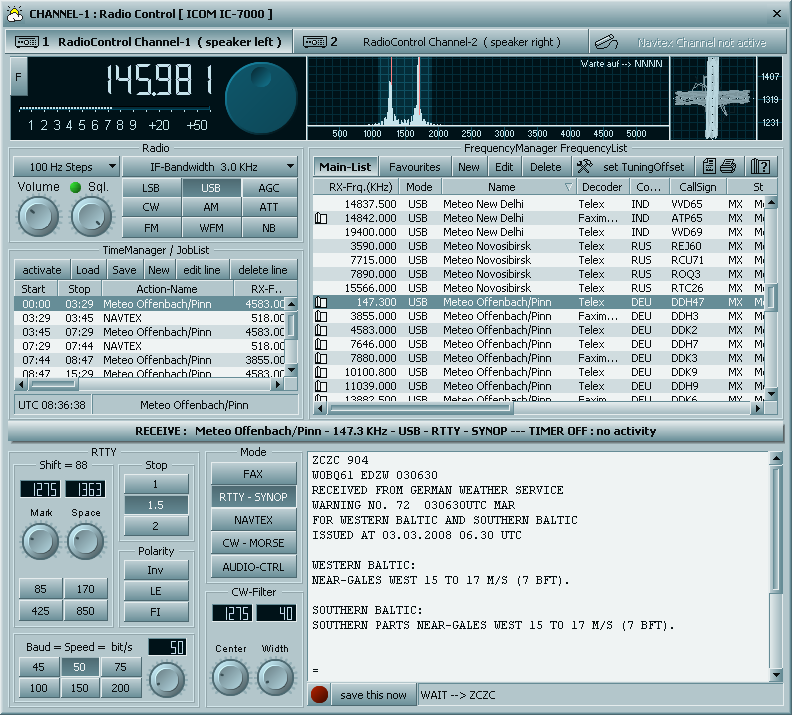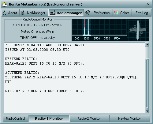 A characteristic is the decoding of forecast time series texts of the DWD, which transfers afterwards into a worldmap. The RadioControl often also receives 5er groups off numbers these are coded signals that are called SYNOP. It is in a number code so that they can be understood in every language, The RadioControl uses this coded data they are then prepared meteorological and mathematically and are decoded into the needed language and placed into the world weather cards so that they can be used with the
